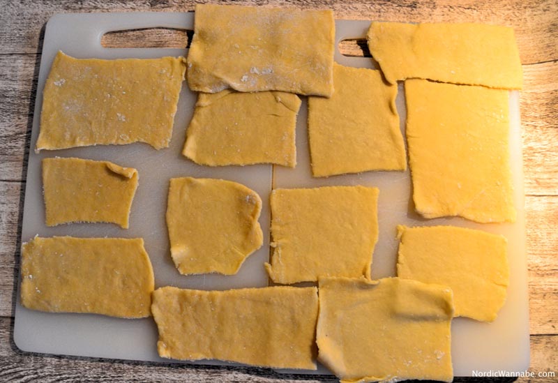 Danach den Teig nochmals durchkneten. Mehl auf der Arbeitsfläche verteilen und den Stück Teig so dünn wie nur möglich ausrollen. Dann den dünnen Teig in Quadrate oder Rechtecke schneiden.