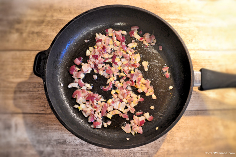 Am Anfang schälen wir die Zwiebel und würfeln sie in kleine Stücke. Dann werden sie in die Pfanne gegeben und in etwas Butter glasig angebraten.