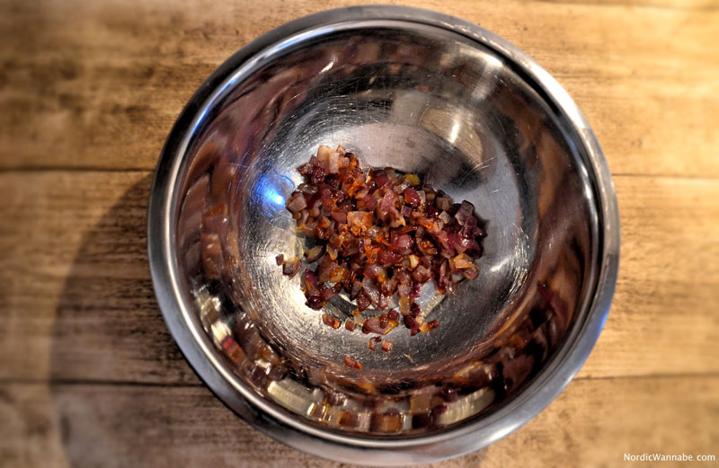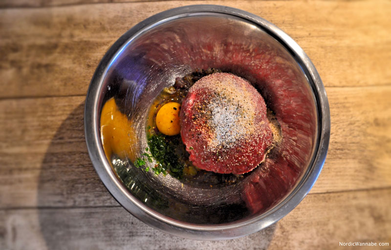 Für die Kötbullar brauchen wir eine Fleischmasse, die aus Hack, Zwiebeln, Ei, Paniermehl und Petersilie besteht. Alles ordentlich mischen und mit etwas Salz und Pfeffer würzen. Sollte der Teig nicht fest genug sein, etwas Paniermehl hinzufügen.