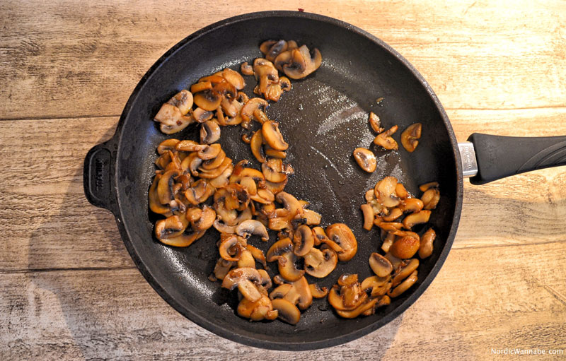 Nun kommen die Champignons in die Pfanne und werden mit etwas Butter angebraten.