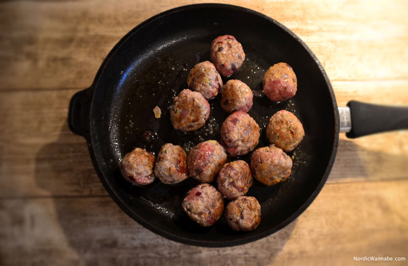 Nach wenigen Minuten sollten die Köttbullar schön braun sein. Sie müssen dann aus der Pfanne raus und auf einem Teller „parken“.