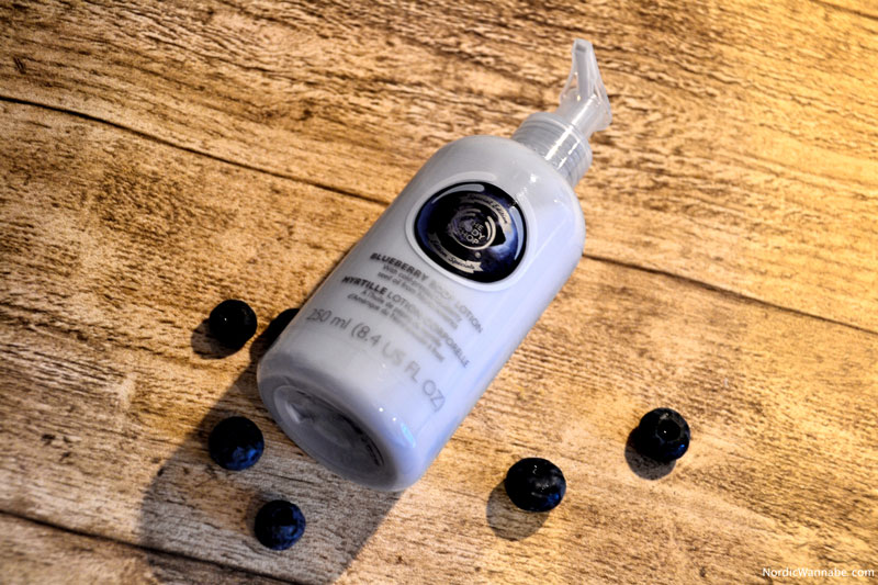 Die Bodylotion ist, wie der Name schon verrät, für den Körper. Auch diese sollte man nicht essen, auch wenn sie unglaublich lecker riecht. Die Verpackung ähnelt einem Seifenspender. Man drückt oben drauf und etwas Lotion kommt raus. So kann man sie portionieren. Nach wenigen Sekunden zieht die Lotion ein und macht die Haut weich. Das liegt vielleicht an dem kalt gepressten Blaubeersamen-Öl, dass in dem Produkt steckt. Allerdings kommt das Öl nicht aus Skandinavien, sondern aus Nordamerika.  Laut Verpackung sollte man es nicht im Gesicht verwenden. Schade, naja. Da hängt ja auch noch die halbe Blaubeer-Butter. 🙂