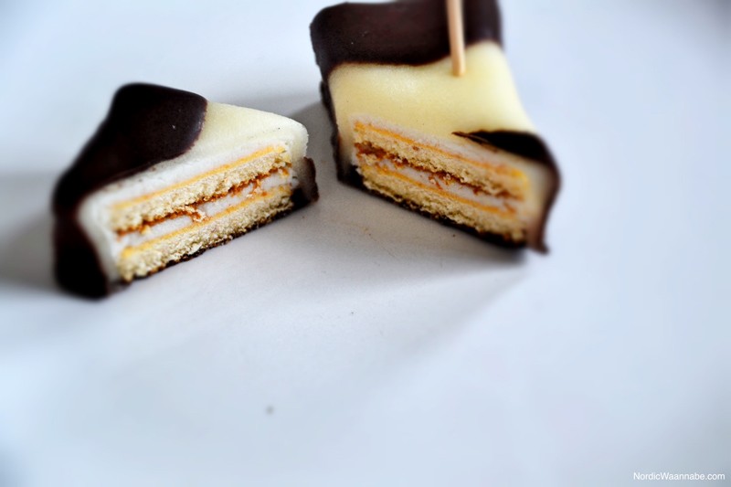 Fangen wir oben an: Die kleinen Teilchen sind mit Schokolade und Marzipan ummantelt. Drinnen gibt es eine weiße süße Schicht mit Kuchenschicht in doppelter Ausführung. Für Veganer sind die Kuchen nicht geeignet, weil Ei enthalten ist. Für etwas Dänemark-Feeling daheim reicht es. 🙂