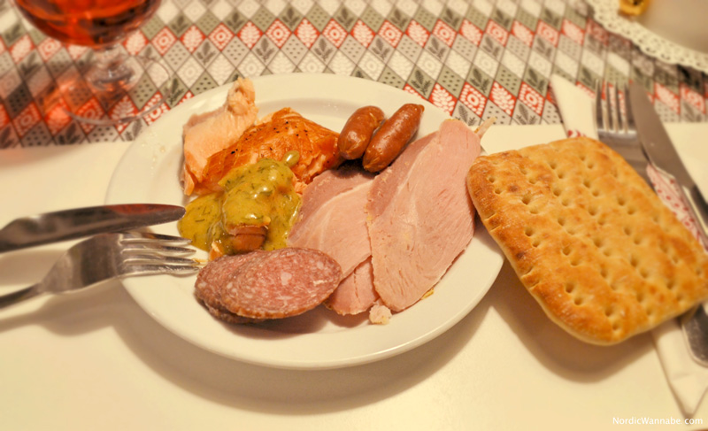 Bei den kalten Speisen gab es Jul-Schinken (JULSKINKA), kleine leckere Elch-Würstchen VILT SNACKS und etwas gröbere Elchwurst VILT KORV. Ei mit geschälten Garnelen: RÄKOR UTAN SKAL. Ei mit KALLES und Ei mit CAVIART – vegetarischer Kaviar. Außerdem gab es Lachs in TUNNBRÖD. Der vegetarische Kaviar hat wie echter Kaviar geschmeckt.