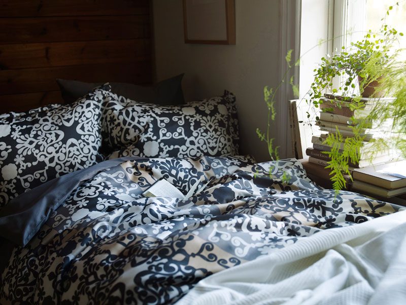 Die neue LJUSÖGA Bettwäsche (imSchrank) bringt mit ihrem Blumenmuster ein romantisches Flair ins Schlafzimmer. Sie besteht aus 100 Prozent Baumwolle, die nachhaltig angebaut wurde. Die HÖSTÖGA Bettwäsche (auf dem Hocker) hat graue Streifen auf weiß und wirkt sehr klassisch. Auch sie ist aus nachhaltiger Baumwolle. Die STENÖRT Bettwäsche ist eine Wendebettwäsche, die entweder Blumenmuster oder klassische Streifen bietet (Foto bitte, oben). Sie besteht aus Perkal, was ein dicht gewebtes, feinfädiges Baumwollgarn mit hoher Fadenzahl ist. HÄXÖRT Bettwäsche ist weiß und hat nur wenige Streifen. Sie ist schlicht, traditionell und wurde, wie alle IKEA Textilien ohne optische Weißmacher hergestellt (letztes Foto). Die PRAKTTRY Bettwäsche wirkt modern und dekorativ, besticht mit einem auffälligen Muster und besteht aus Lyocell und Baumwolle. Neben all der Bettwäsche gibt es auch einen neuen Teppich: Den HOVSLUND Teppich. Er ist dunkelgrau, mit Muster und sehr schmutzabweisend. Ideal für den Ess-Bereich.