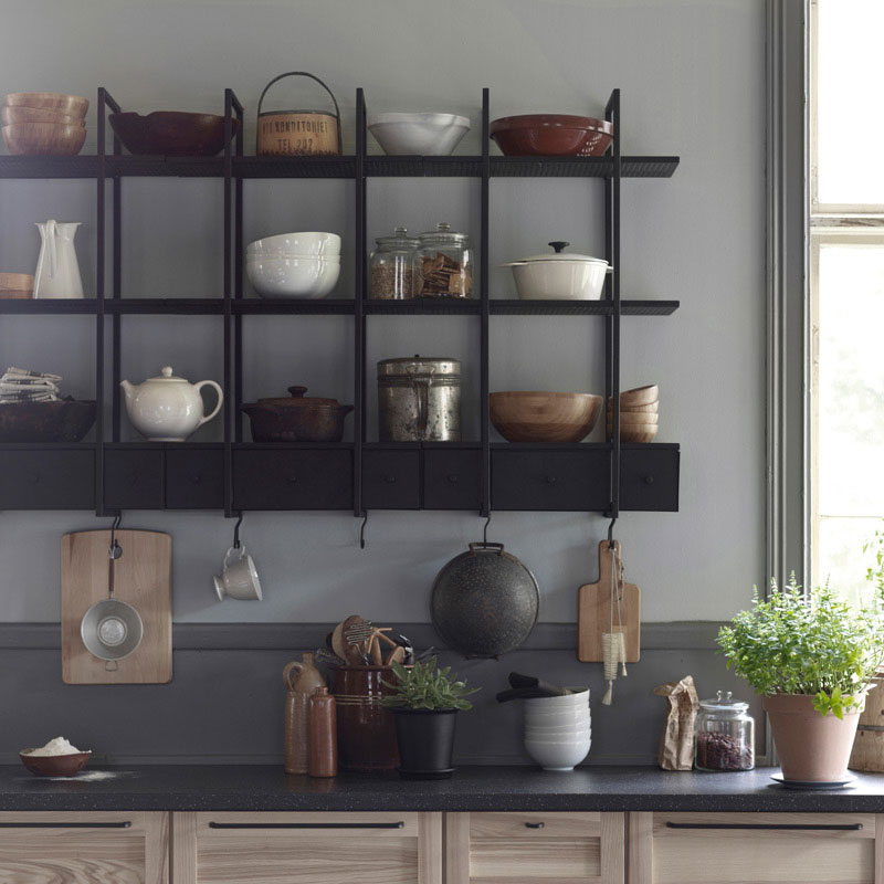 Designer Mikael Axelsson entwickelte passend zur TORHAMN-Küche das FALSTERBO Wandregal sowie die die Wandschiene mit vielen Haken.