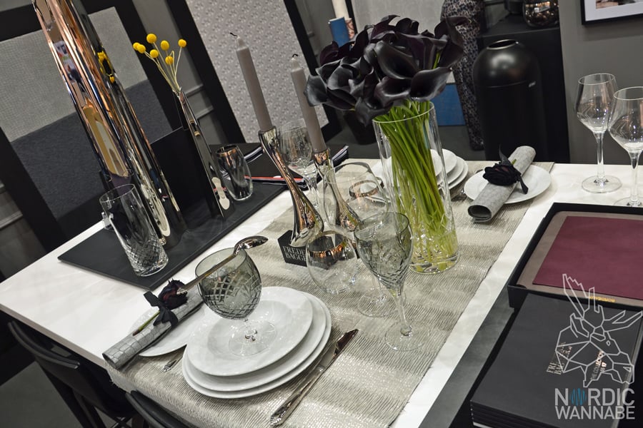 Wie man vielleicht schon auf den ersten Blick erkennt, war der Messestand sehr stylisch eingerichtet. Es lief laute Musik, die mich irgendwie an Runway-Musik erinnerte, auf dem Bildschirm liefen Fashion-Videos in Kombination mit den Produkten und auch die verschiedenen Themenwelten, wie „Bar“ und „Esstisch“ wurden gezeigt.