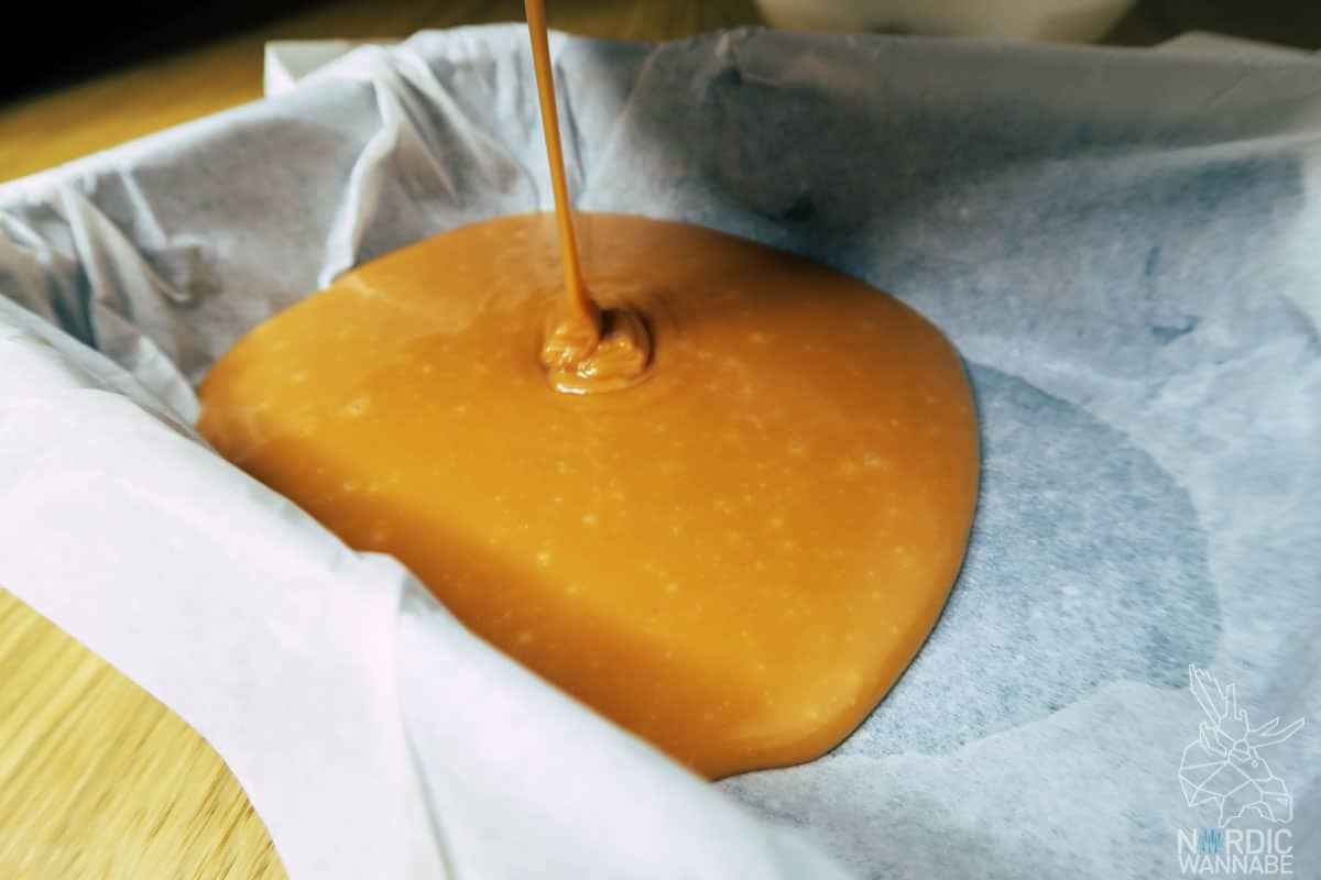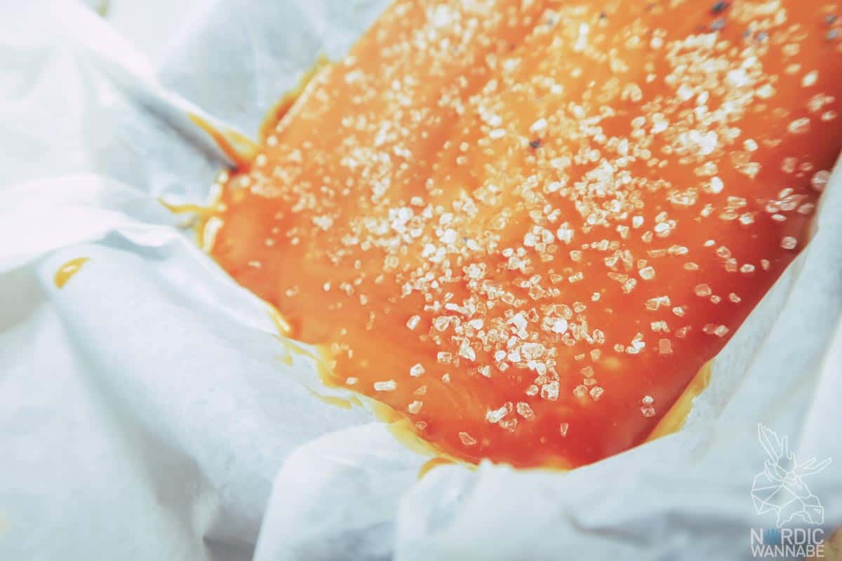 Lasst die Masse einfach bei Zimmertemperatur abkühlen bis sich eine glänzende Oberfläche bildet, die immer fester wird. Jetzt die Karamellmasse, wie Ihr mögt, mit etwas Salz bestreuen und dann vollständig für 30 Minuten im Kühlschrank auskühlen lassen. Den Topf am besten gleich abspülen, damit keine harten Karamellreste kleben bleiben.