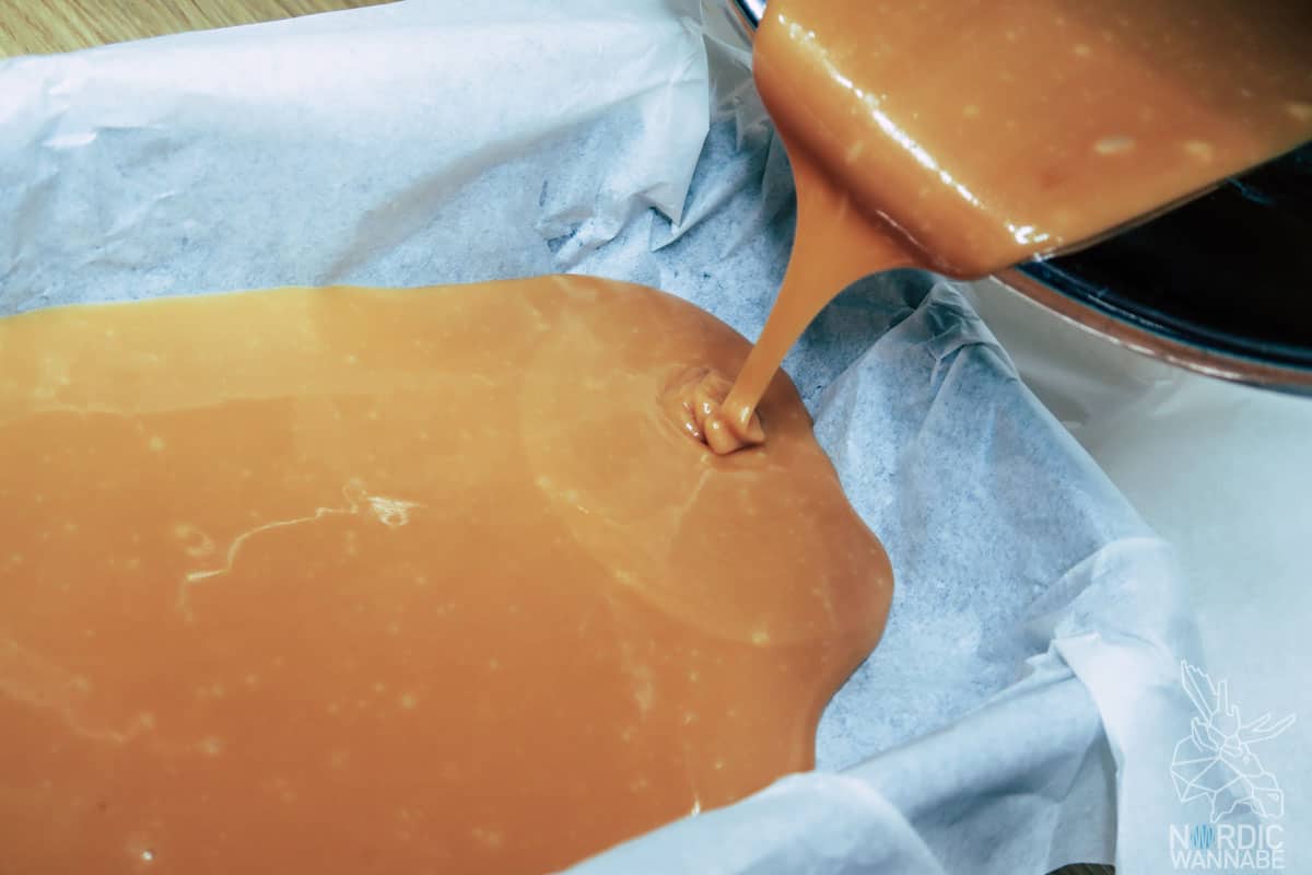 Dann braucht Ihr einen großen Topf. Darin dann die Sahne, den Zucker, den Honig, den Vanillezucker und die Butter bei mittlerer Temperatur schmelzen lassen. Dann die Temperatur erhöhen und Alles für sieben bis zehn Minuten kochen lassen. Dabei solltet Ihr die Masse ständig umrühren. Die Konsistenz ändert sich langsam, die Masse wird zäh und es bilden sich immer größere Blasen. Ganz wichtig ist, dass nichts anbrennen darf. Ihr könnt die zähe Masse in die Form gießen, wenn sie goldbraun geworden ist nachdem sie sich etwas im Topf abgekühlt hat.