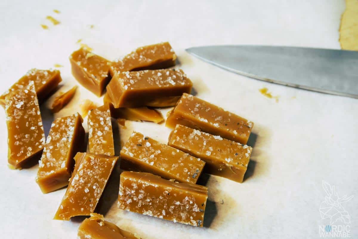 Wenn Ihr Alles richtig gemacht habt, habt Ihr nun einen Karamellblock, den man einfach aus der Form heben kann. Sollte das Papier kleben am Karamell einfach mit Vorsicht leicht abziehen. Dann braucht Ihr ein großes, scharfes Messer zum Teilen der Bonbons. Ihr könnt es auch leicht einölen. Wundert Euch bitte nicht. Denn die Karamellbonbons sind hart und keine weichen Fudge-Bonbons. Zum Einwickeln der Bonbons habe ich Butterbrot-Papier zugeschnitten und noch passend zum Valentinstag mit Herzen oder „LØVE“ verziert.
