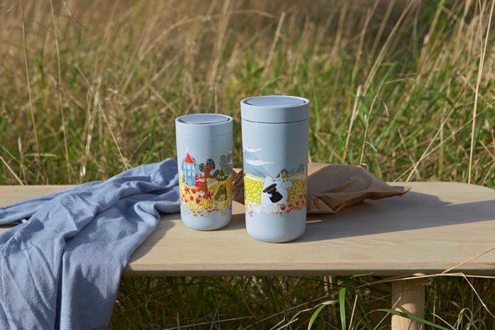 Hej, von Stelton aus Dänemark gibt es neue Moomin Becher, Flaschen und Thermobecher zum Mitnehmen mit beliebten Motiven der finnischen Autorin Tove Jansson.