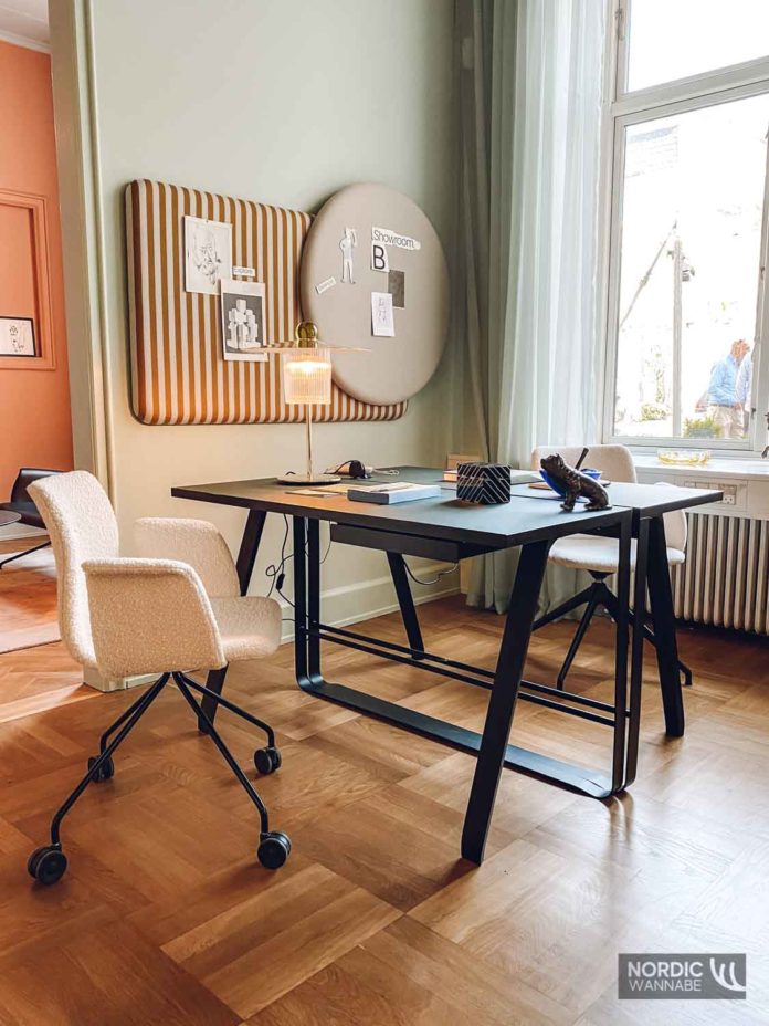 „Wählen man die schwarze Variante ohne Polsterung, und passt sie perfekt in eine minimalistische Einrichtung. Oder wählt man den Stuhl in Eiche mit gestreiftem Bezug und erzielt man einen warmen Ausdruck, der perfekt zu einem modernen, skandinavischen Interieur passt. Wenn man mutig ist, können Stühle mit und ohne Polsterung kombiniert werden und dem Esszimmer durch die verschiedenen Oberflächen einen besonderen Touch verleihen“, empfiehlt die Stylistin.