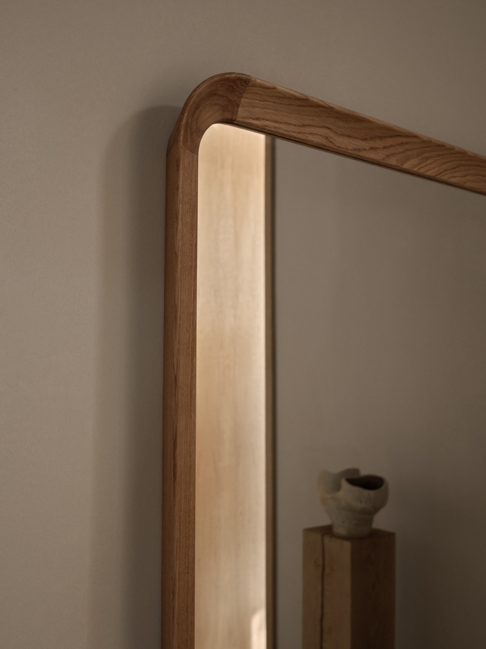 Der Radio House Spiegel ist mehr als nur ein Möbelstück; er ist ein künstlerisches Statement. Das massive Eichenholz, sorgfältig von Hand gefertigt und mit höchster Präzision zusammengefügt, verleiht ihm eine zeitlose Eleganz. Anne Møller Sørensen von Vilhelm Lauritzen Architects betont die einzigartige Ästhetik des Spiegels: „Der Radio House Spiegel ist ein Möbelstück für sich und viel mehr als nur ein flacher Gegenstand. Das organische Holzprofil und die wunderschöne Art und Weise, wie es das Spiegelbild einrahmt, wirken fast barock. Wir haben uns entschieden, den Spiegel in Eichenholz zu fertigen, um ihm einen modernen, nordischen Look zu verleihen.“